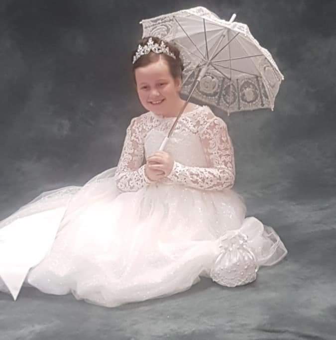 Teegan never took her smile of her face from the second she put her communion dress on..she felt like a royal princess..the lace sparkle colour ivory & detail that went into her dress tje beautiful big bow was outstanding.. all teachers priest & parents stopped to ask where she got her stunning dress.. teegan glowed the whole day in her dress as it was the most amazing dress we have ever seen ..